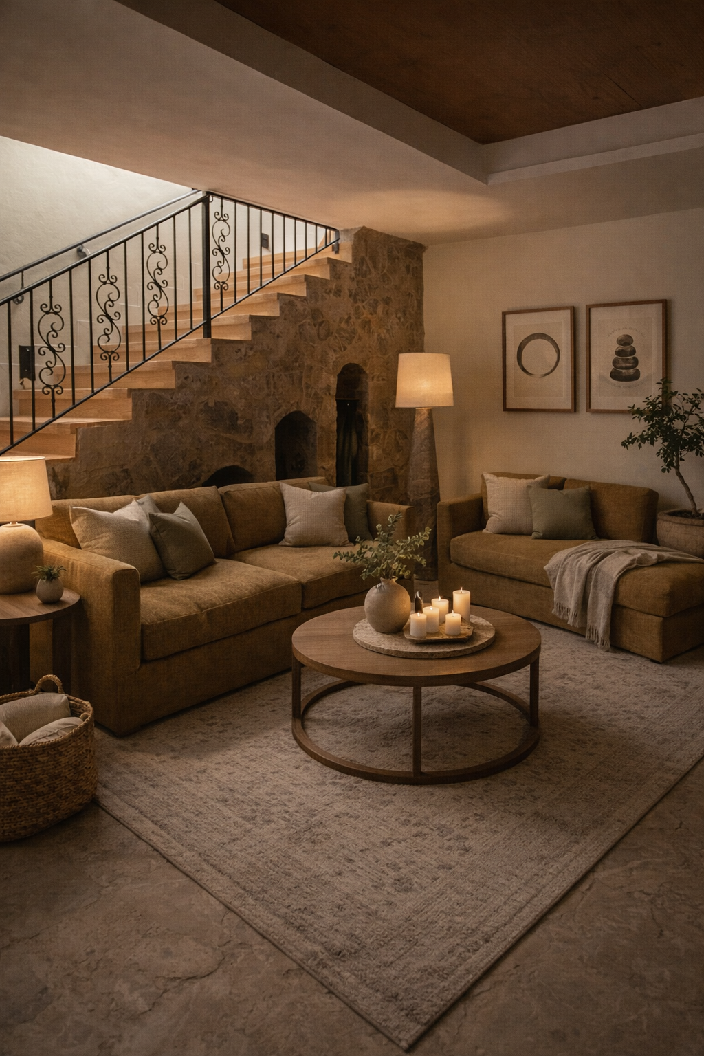 "Textural drama meets cinematic escape. Featuring locally sourced stone surfaces and a custom-designed wrought iron railing, this media room balances heavy, organic materials with the sleek precision of modern living."