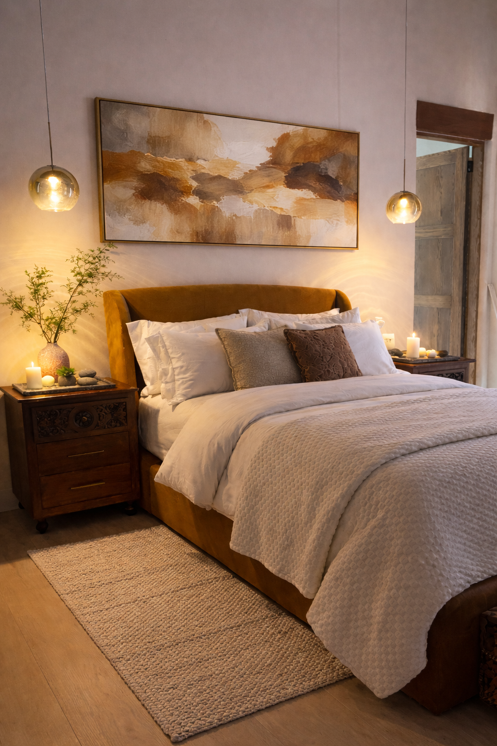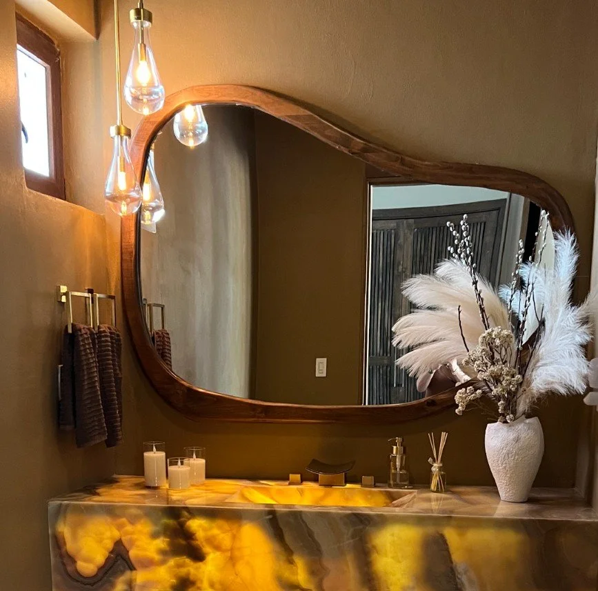 "In this intimate powder sanctuary, the atmosphere is defined by the deep, moody glow of curated local Onyx. Hand-selected and masterfully fabricated by local artisans, the stone’s translucent veining is brought to life by a bespoke statement mirror. It’s a sophisticated marriage of raw earth and precise contemporary design."